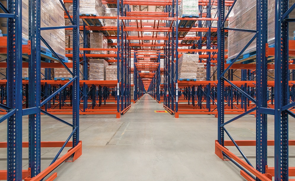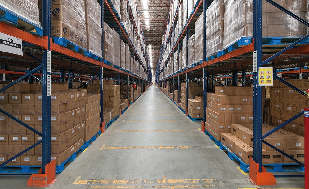 Mecalux ha suministrado estanterías selectivas de simple y doble profundidad de 11,4 m de altura, con cinco o seis niveles, y 152 m de longitud. En total, presentan una capacidad de almacenaje para 83.569 estibas de 1.000 x 1.200 mm.