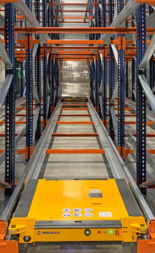 Mecalux ha instalado un bloque de estanterías de 29 m de longitud y 8 m de altura con el sistema Pallet Shuttle semiautomático. El bloque de estanterías ocupa tan solo 350 m2 y puede almacenar hasta 1.120 estibas.