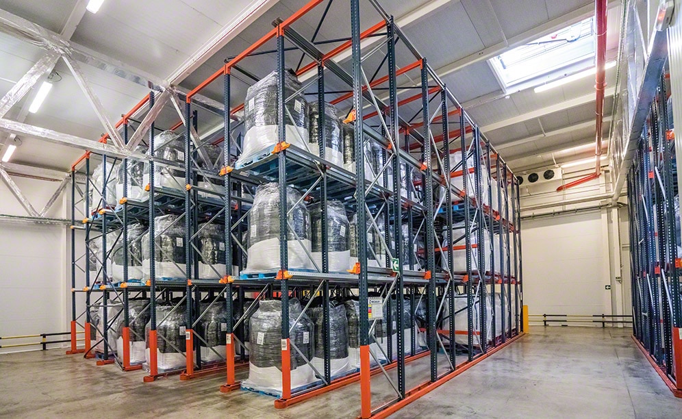 Las estanterías se componen de un conjunto de calles de 6,5 m de altura, cada una de ellas con tres niveles. Por su parte, cada nivel cuenta con carriles de apoyo fabricados con chapa de acero galvanizado de elevada resistencia donde se depositan las estibas con los sacos encima.